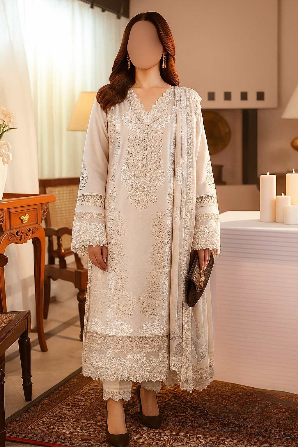 FABRIC:* Soft Cotton* Soft Chiffon Dupatta with Four-Side Embroidery DETAILS:* Front: Chikankari and-Multithread Embroidery* Back:...