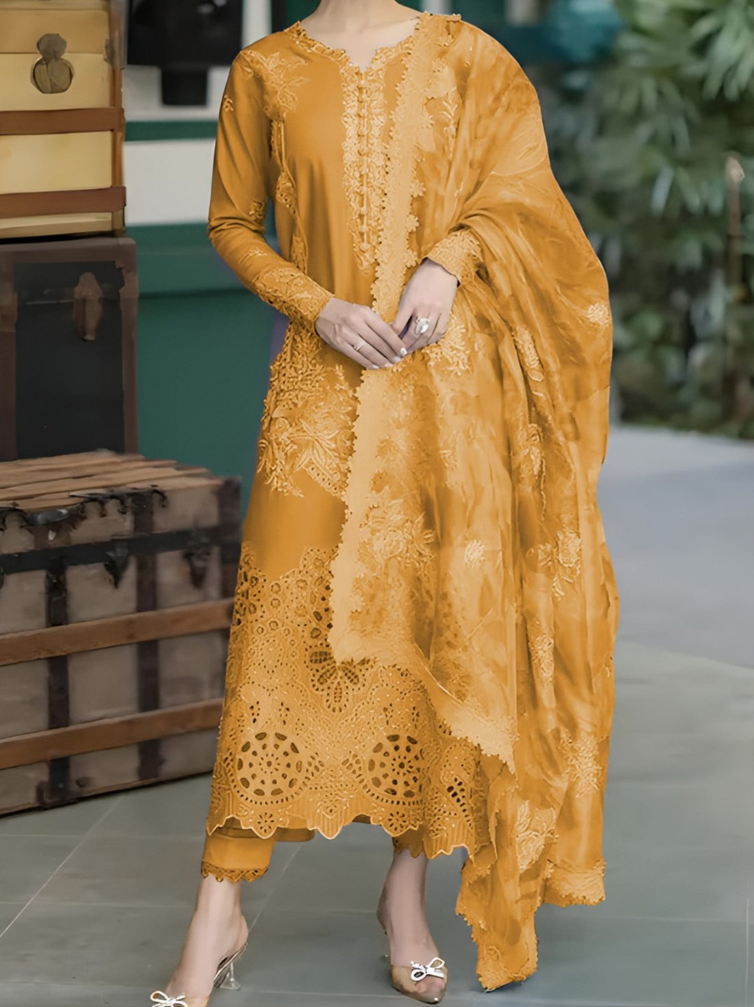 FABRIC:* Soft Cotton* Soft Chiffon Dupatta * Color: Golden DETAILS:* Front: Chikankari and-Same & Multithread...