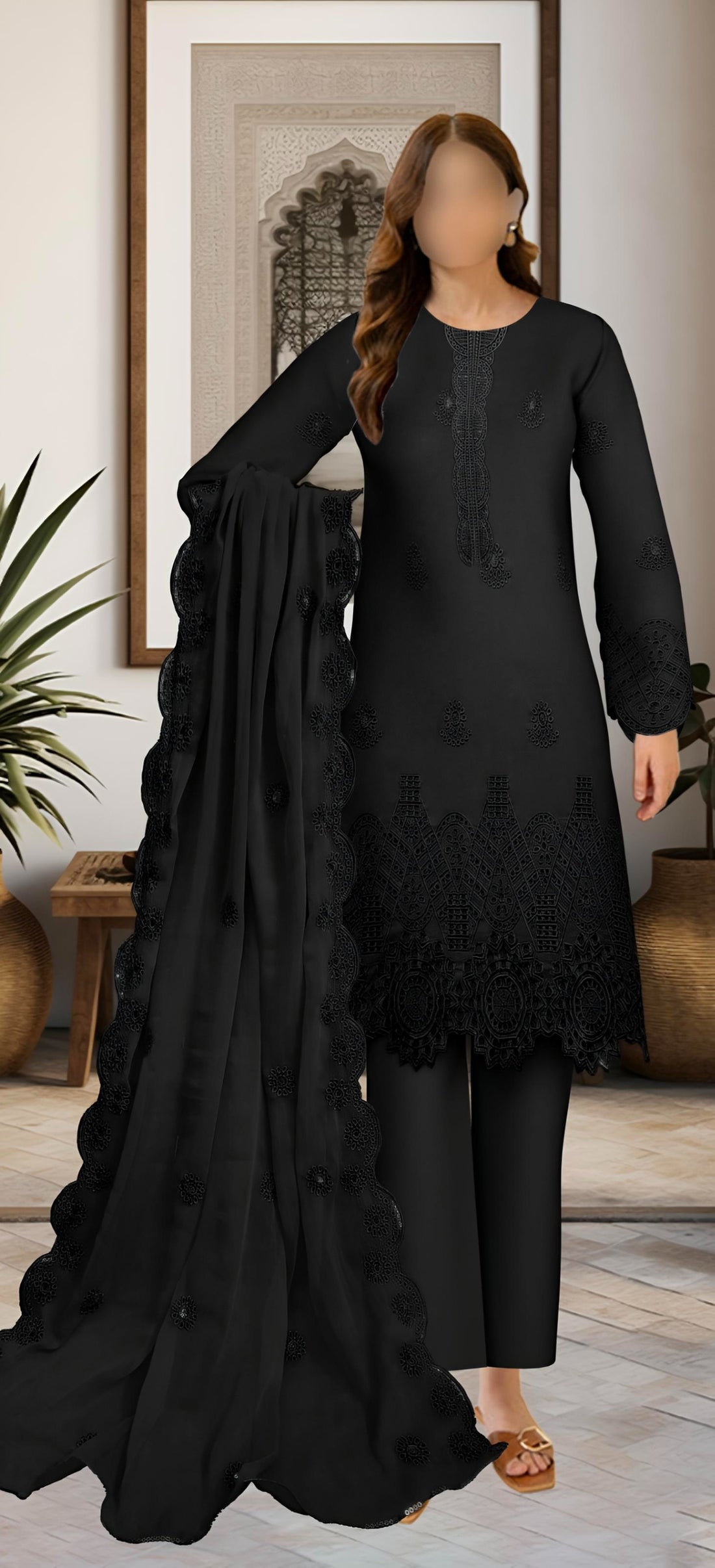 FABRIC:* Soft Lawn Cotton* Soft Chiffon Dupatta * Color: Black DETAILS:* Front: Thread + Sequins...