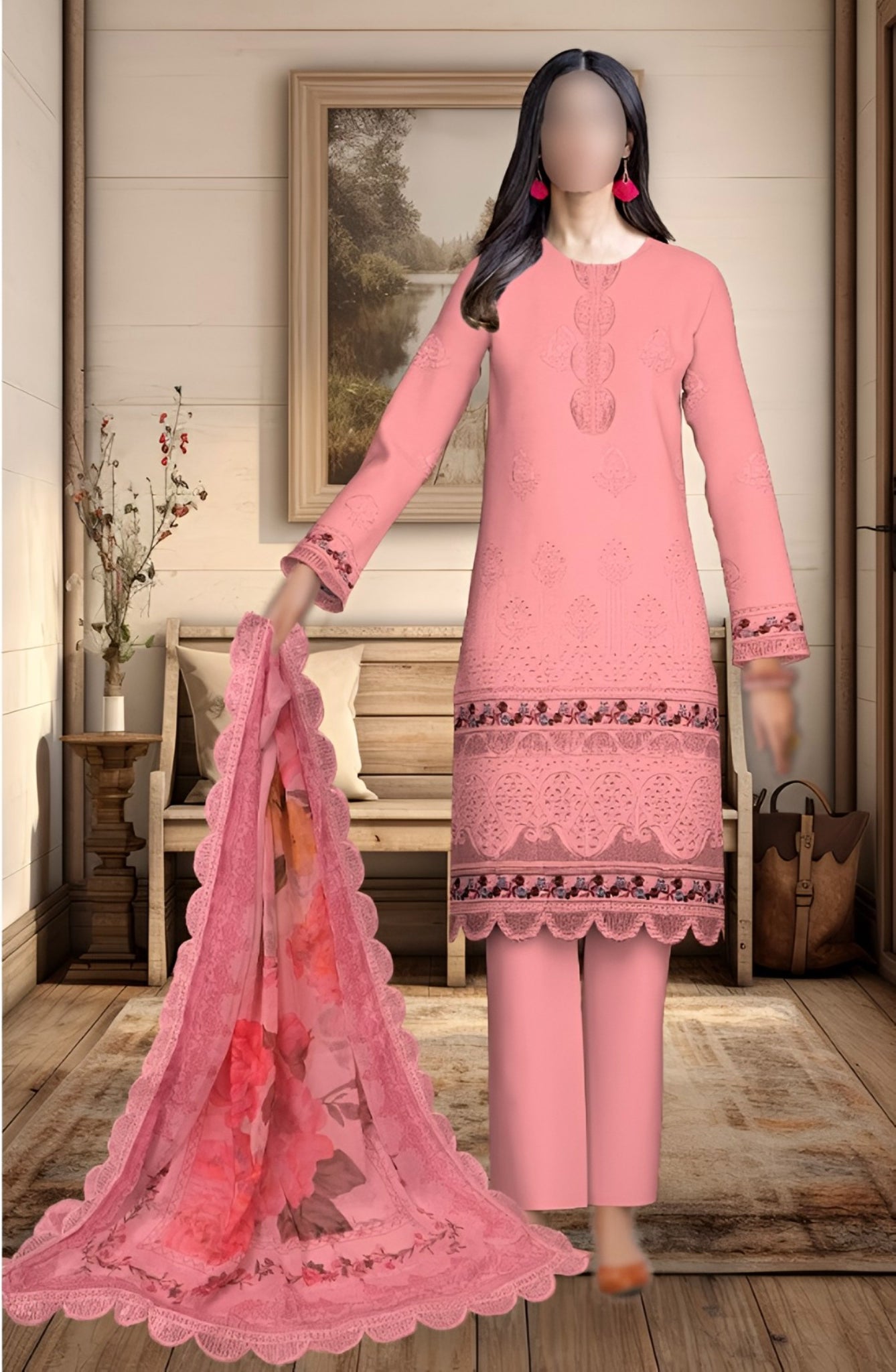 * Dupatta: Digital Printed Chiffon with 4 Side Embroidered Borders