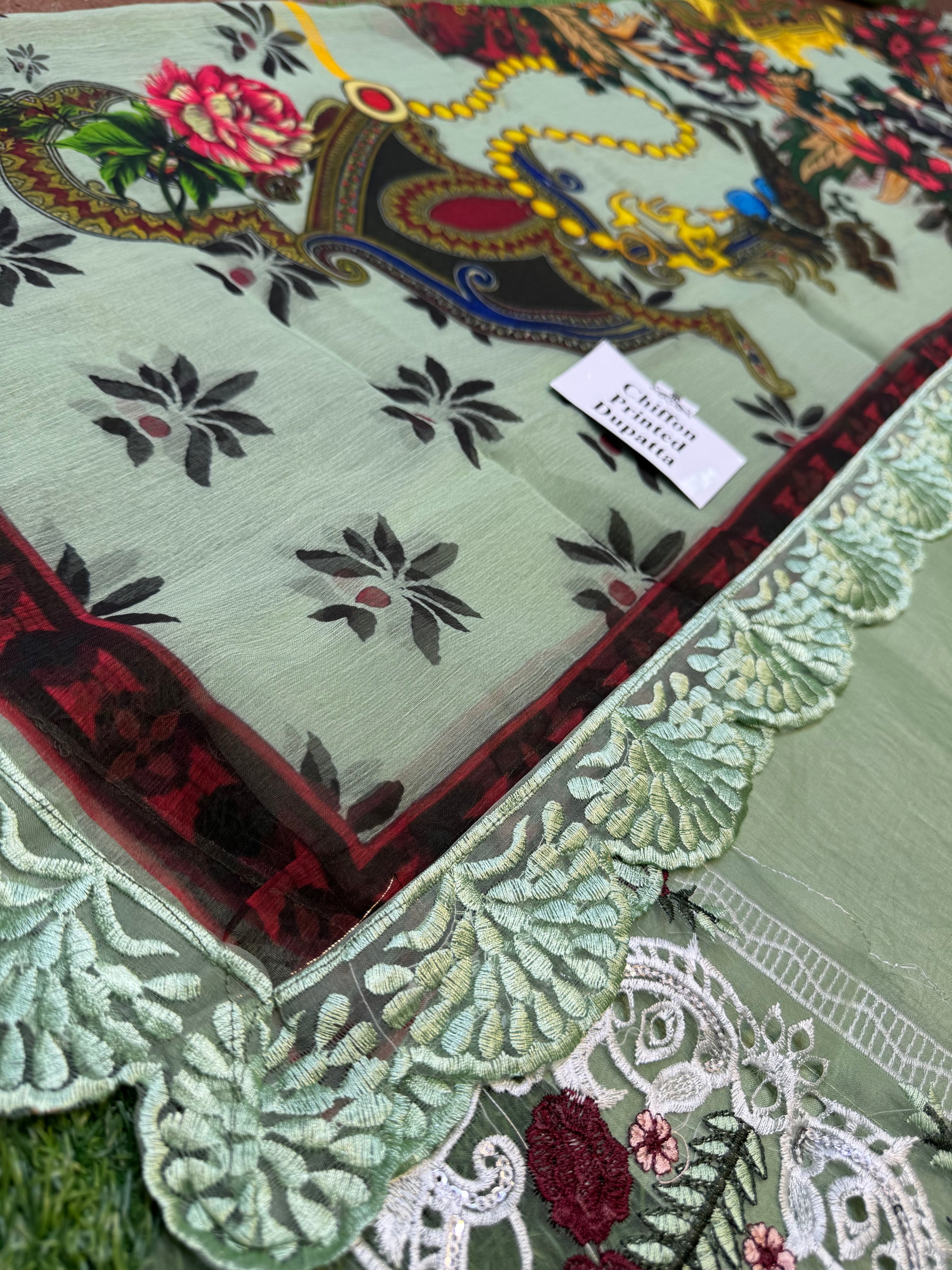 • Dupatta: Digital Printed Chiffon Dupatta with 4 Side Embroidered Borders