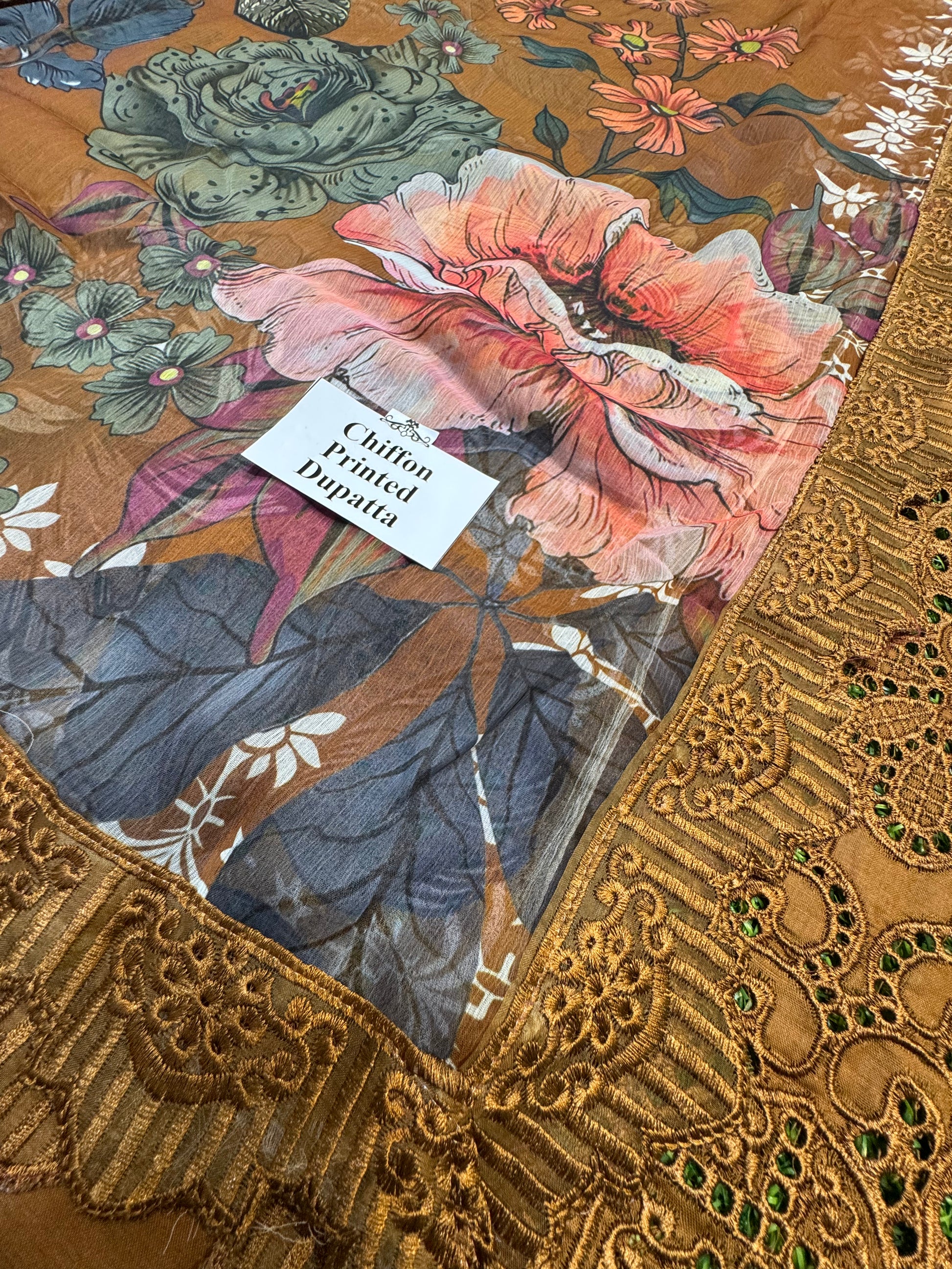 * Dupatta: Digital Printed Chiffon Dupatta With Four Side Lace Border Embroidery