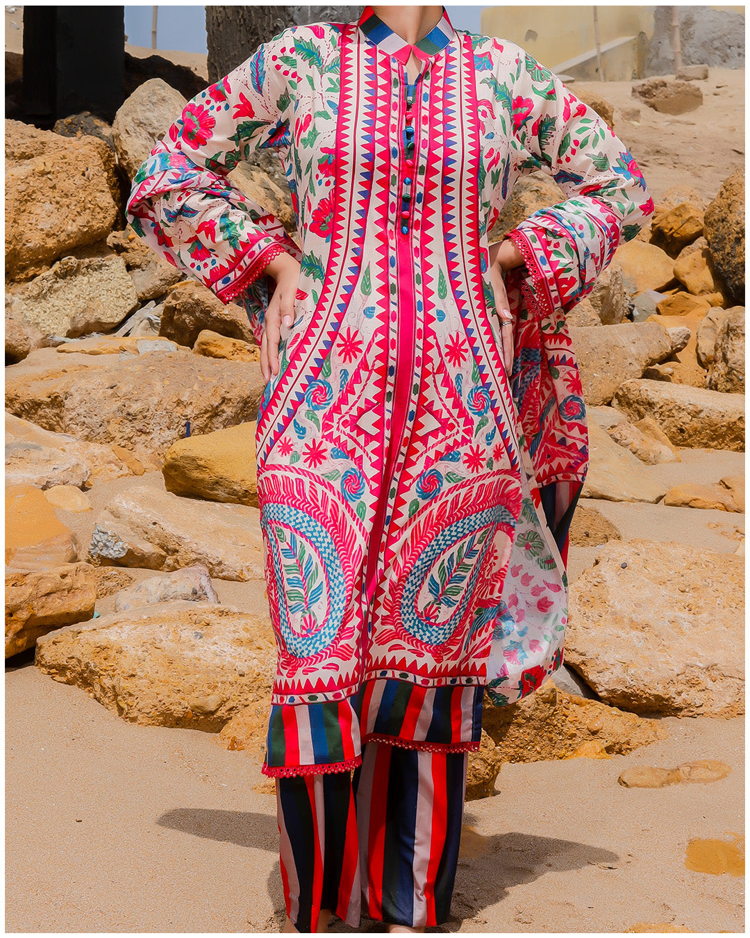 Product Description Elevate your wardrobe with this elegant 3-piece unstitched lawn suit inspired by the...